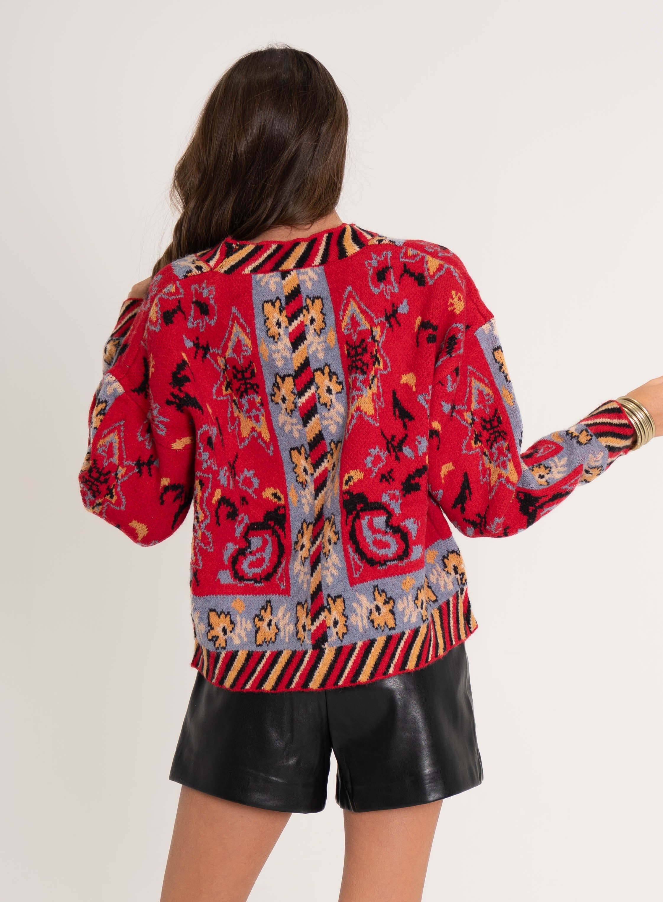 Wrap yourself in artistic flair with this stunning red abstract floral cardigan. Featuring bold, eye-catching blooms in a modern design, it's the perfect layer for adding personality to any outfit. The soft, comfortable knit makes it ideal for casual days or dressed-up occasions. Whether you're heading to brunch or cozying up at home, this playful piece brings color and charm to your wardrobe. A versatile essential that celebrates your unique style.