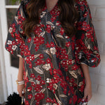 Elevate your evening look with this stunning red and gold embossed mini dress. The rich crimson fabric features intricate gold detailing that catches the light beautifully, creating an eye-catching shimmer perfect for nights out. The flattering mini silhouette offers a modern, confident vibe, while the embossed texture adds sophisticated dimension. Whether you're heading to a party or a special occasion, this dress delivers glamour with an effortless edge. Pair it with heels and minimal accessories to let the dress shine.