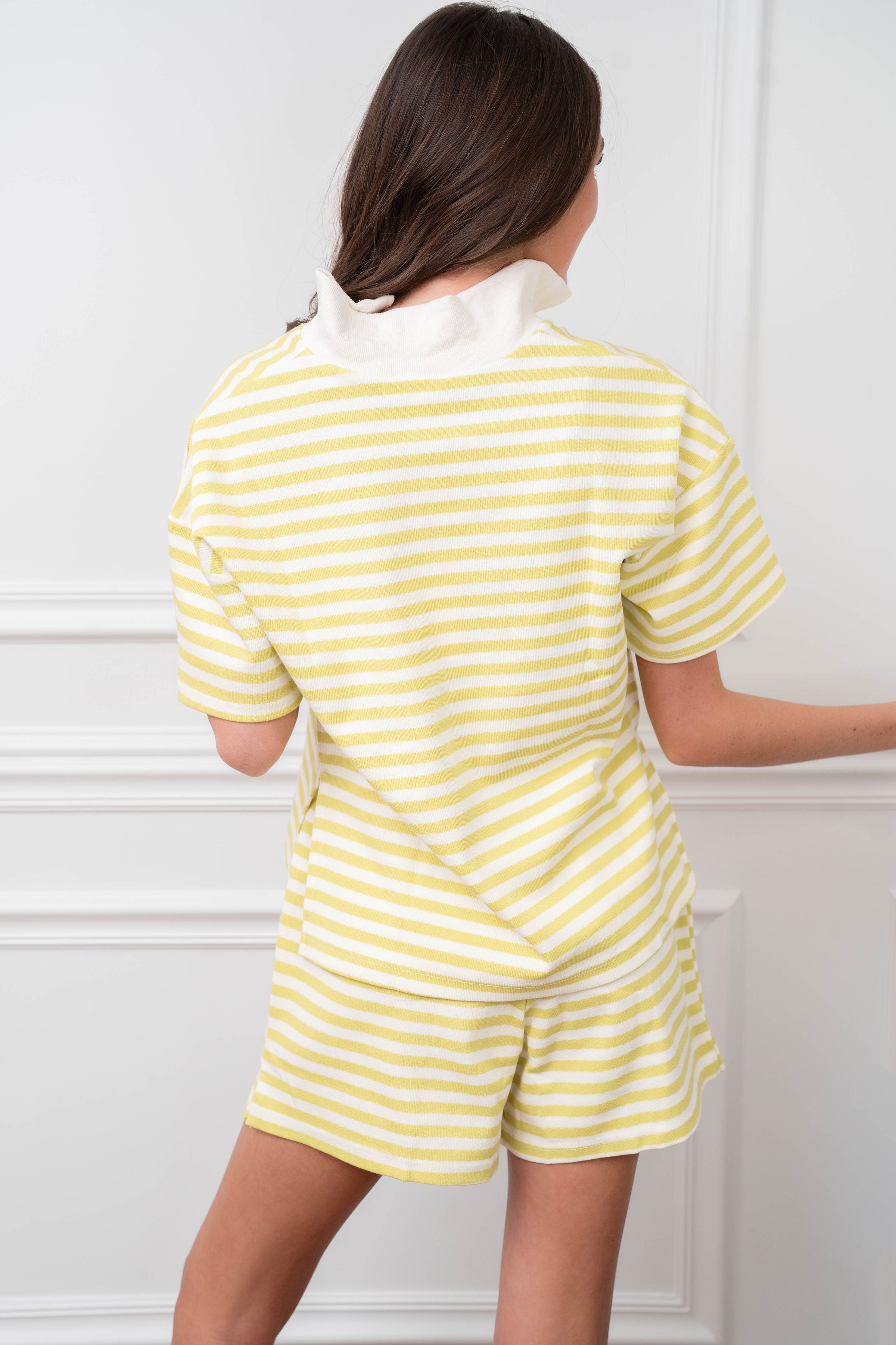 Brighten your wardrobe with this vibrant chartreuse short set. Perfect for casual outings or relaxed weekends, this two-piece ensemble combines comfort with contemporary style. The eye-catching color makes a bold fashion statement while the coordinated pieces work seamlessly together. Ideal for layering or wearing separately, this set offers versatility for any season. Elevate your everyday look with this fresh, modern addition to your closet.