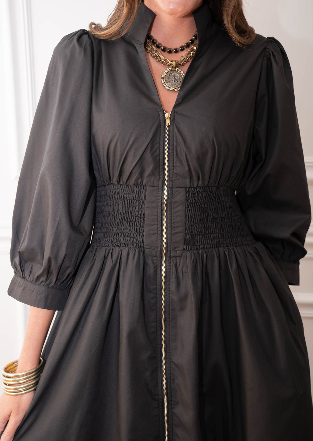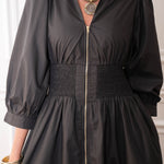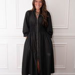 The Entro Hallie Dress features a sleek black elastic waistline that ensures a comfortable, flattering fit throughout the day. Its elegant gold front zipper adds a refined touch, combining practicality with stylish detail for easy wear and a polished look. Ideal for transitioning from day to night, this dress balances comfort and sophistication effortlessly.