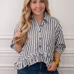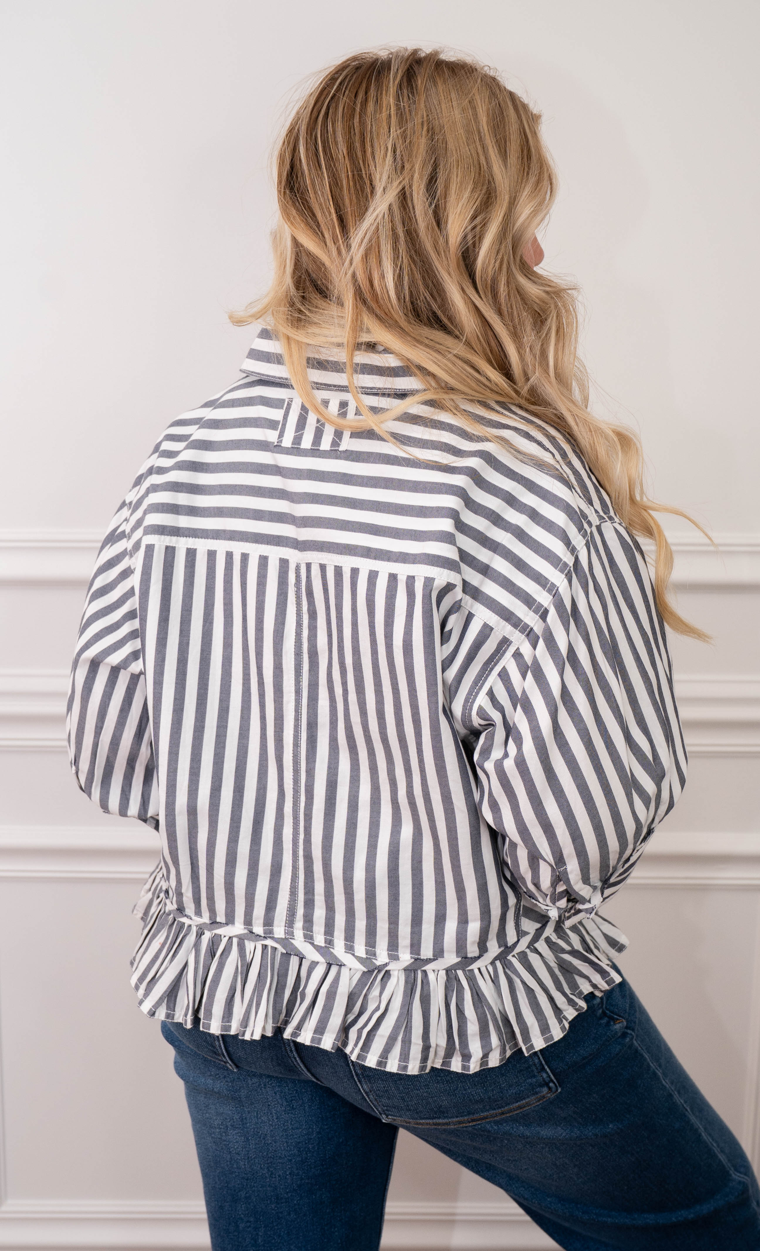 Nautical stripes meet effortless charm in this Free People button-up top. The classic navy and white combo gets a flirty upgrade with delicate ruffle trim that adds movement and personality to every wear. Perfect for layering over basics or styling solo, this piece brings that breezy, carefree vibe to your everyday rotation. Whether you're heading to brunch or a casual weekend adventure, this striped beauty keeps things fresh and fun.