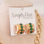 Slip on sophistication with these stunning gold hoops adorned with lush emerald green jewels. Perfect for adding a pop of color and glamour to any outfit, these beauties strike the ideal balance between timeless elegance and fun flair. Whether you're dressing up for a special occasion or elevating your everyday style, these jeweled hoops are your go-to accessory for turning heads and feeling fabulous.