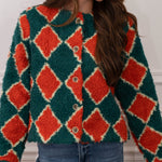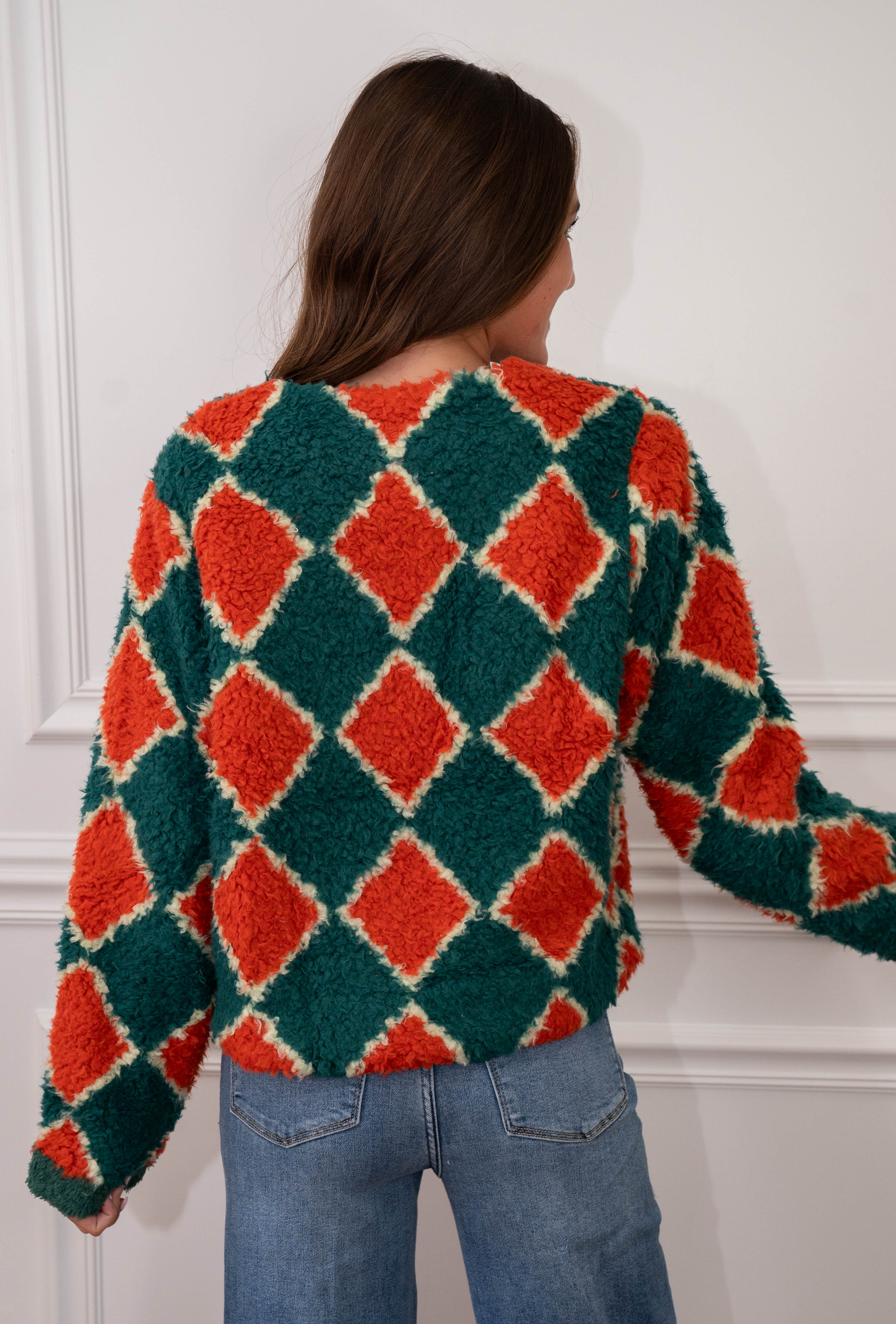 Wrap yourself in cozy charm with this whimsical Harlequin Sherpa Cardigan. Featuring a bold diamond pattern in contrasting hues, this oversized layer brings instant personality to any outfit. The plush sherpa lining delivers cloud-like comfort perfect for lounging or casual outings. Pair it with your favorite jeans or dress it up over a slip dress for effortless style. A fun, statement piece that proves comfort doesn't have to be boring.