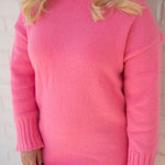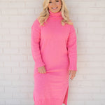 Elevate your wardrobe with the Kallie Sweater Dress, featuring a soft turtleneck and a vibrant bubble gum pink hue. Crafted for both comfort and style, this dress offers warmth with a flattering silhouette that enhances your shape. Its cozy knit fabric makes it perfect for cooler days while standing out with a playful yet sophisticated color. Ideal for layering or wearing alone.