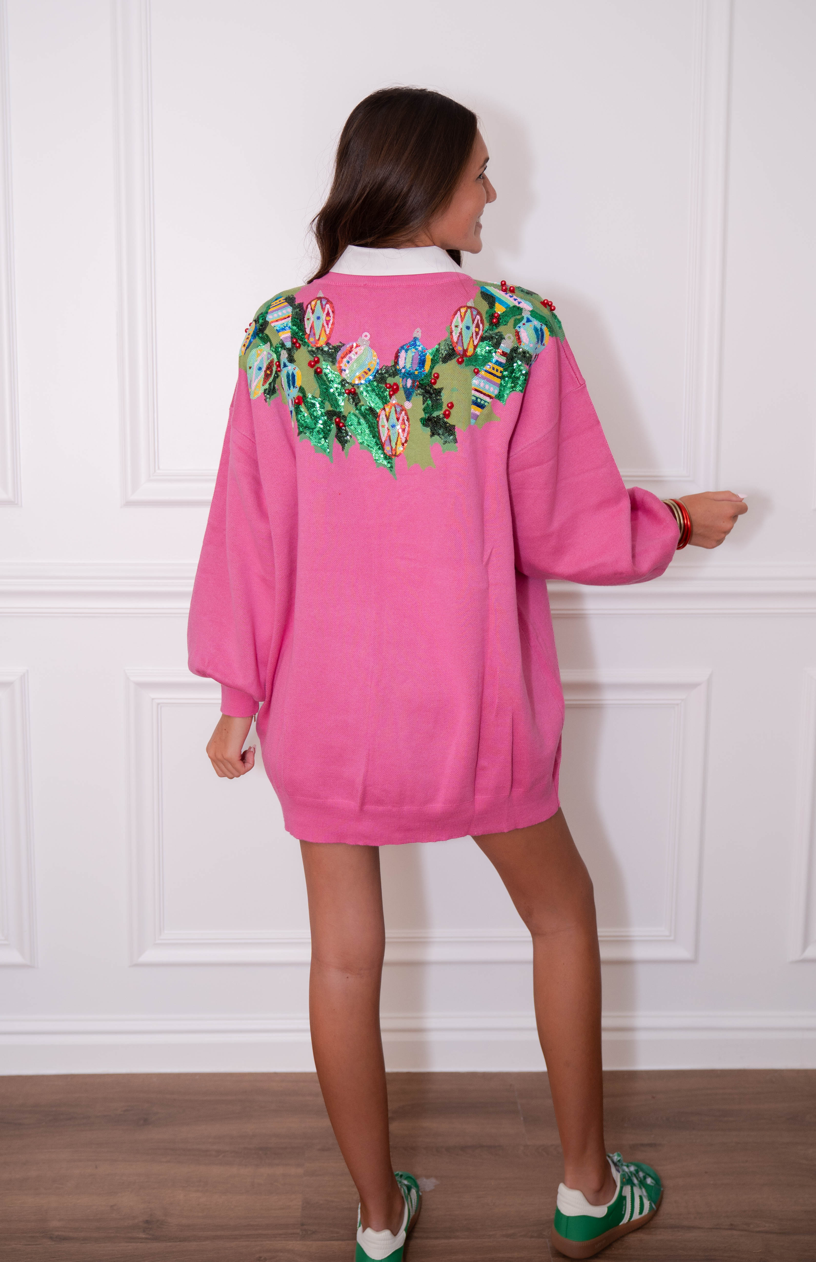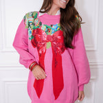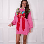 Get ready to dazzle this season in the Queen of Sparkle Wreath Sweater Dress! Featuring a festive red bow and shimmering details, this playful sweaterdress brings holiday cheer wherever you go. Cozy yet stylish, it’s perfect for parties or cozy nights in—wear your holiday spirit with a wink and a twinkle!